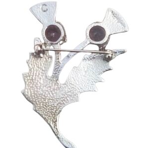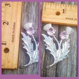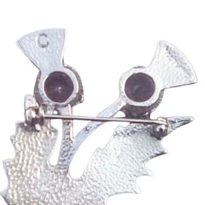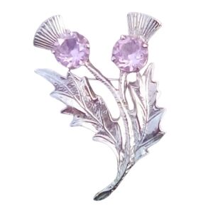 Charming vintage Scottish thistle brooch in silver tone with two sparkling purple glass stones. Measures 2" × 1.26", weight 0.50 oz. Dates to the mid-century era (1940s-1960s), when this textured reverse and safety piece was popular in costume jewelry. A lovely floral accent with Celtic heritage styling, perfect for scarves, jackets, or dresses. Excellent vintage condition -- open to offers!