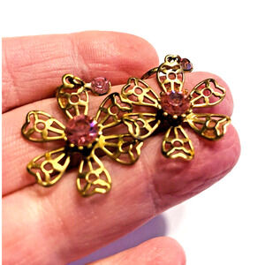 Vintage Screwback Earrings done in a mod hippie chic look - goldtone filigree metal settings with a center round pink rhinestone - these look like daisies that drop & dangle - absolutely charming and so fun! No hallmarks but nice quality fashion jewelry from the 1960's / 1970's. So pretty - the perfect addition to a chic dress or casual top & jeans. In excellent vintage condition - minor surface wear - no damage or flaws - just stunning!
