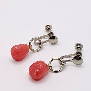 A silver tone screw Ons feature natural stone ( pink with white striations stone, agate?) dangles.