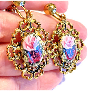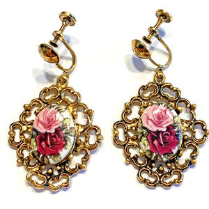Vintage Screwback Earrings - gorgeous ornate goldtone filigree shapes that drop & dangle. Each earring has a painted porcelain center with pink and red roses motif. These are 1970's does Victorian style - no hallmarks - nice quality fashion jewelry with an old world charm. A romantic cottage core style that will go with everything from formal to casual and draw compliments galore. In excellent vintage condition - minor surface wear - no damage or flaws - so pretty!