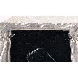 This vintage stained glass photo frame features a scrolled peachy pink color with pewter trim, measuring 8.5"x6.5". The rectangular frame is suitable for a 6.5x4.5" photo, with an art deco style and glossy finish. The frame is suitable for all occasions and is designed for rear-loading photo insertion. Made of glass with a multicolor pattern, this ornate and reflective frame is perfect for adding a touch of elegance to your home décor.