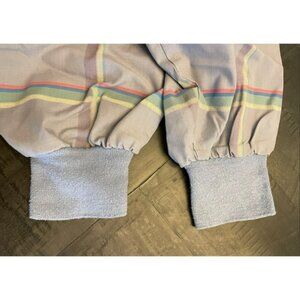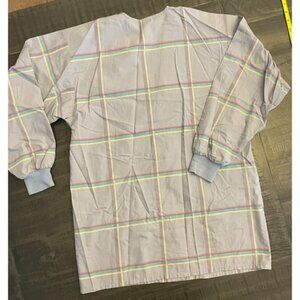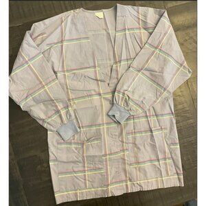 Vintage scrubs jacket. Pretty pastels, lavender, lilac, light green, gray, yellow. Snap front with pockets. Ribbed sleeves. See pics for measurements. Great condition. Size Small.