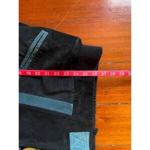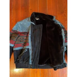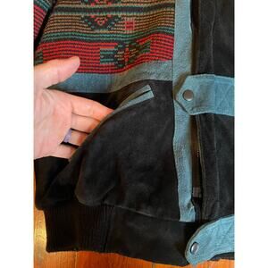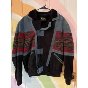 Vintage Scully men’s Southwestern bomber jacket in size Large. Black body with faded blue suede-look trim, multicolor woven Aztec style tapestry panels across chest and sleeves, and a super soft faux-fur lining and collar. Strap and snap front placket over hidden closure, welt pockets, ribbed knit hem and cuffs. Very warm, very western, and an awesome statement piece.