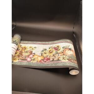 This Vintage Seabrook Vinyl Wallpaper Border features a charming Sunflower Baskets and Pumpkin Vegetables pattern in a vibrant multicolor design. Made of durable vinyl material, this border is easy to apply with its pre-pasted finish. With a coverage of 5 yards and is almost 7 inches wide, a package quantity of 2 rolls, this Brewster Wallcovering product adds a touch of country style to any home decor, perfect for adults looking to enhance their living space with a unique and washable design. Made in Canada, this wallpaper border is both stylish and practical for any room in the house. One opened to get pictures of the design.