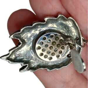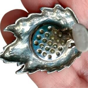Beautiful vintage Seagull Pewter clip-on earrings dated 1988, featuring a detailed leaf design with softly sculpted edges and a dangling faux pearl teardrop. These have a lovely handmade look—classic to Seagull’s pewter work—and a refined, nature-inspired style.