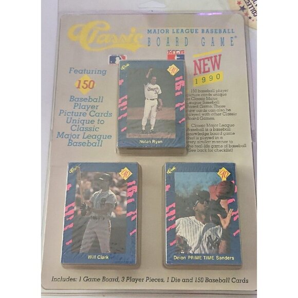 Vintage Classic MLB Board Game 150 Player Picture Cards Unique To Classic Brand Games. Includes game board, 3 player pieces and 1 die. A twist on the normal trivia game. Staring cards of Nolan Ryan, Will Clark and Deion PRIME TIME Sanders.