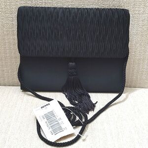 NWT Vintage Sears Black Tassel Evening Shoulder Bag Clutch. This gorgeous bag features a pleated foldover flap with a snap closure, black tassel, braided rope strap, and a black interior with 1 slide pocket. Can be worn as a shoulder bag or tuck the strap inside the bag and wear it as a clutch. Large enough to hold all of your essentials.