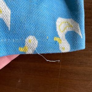Long sleeves with cuff, front zip closure, white & blue collar & cuffs, full leg snaps, back elastic gathering, blue with white duck print.