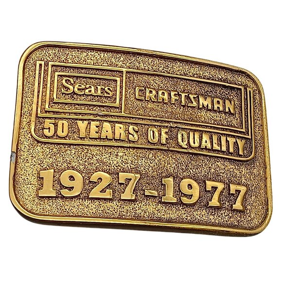 This vintage belt buckle commemorates 50 years of Sears Craftsman's commitment to quality, spanning from 1927 to 1977. Crafted in a gold tone, it features bold, embossed lettering and a rectangular shape. A remarkable piece of history and craftsmanship, it serves as a nostalgic tribute to a trusted brand.