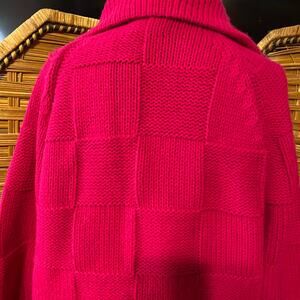 Gorgeous vintage Sears Mary Lewis cardigan sweater in a vibrant hot pink color. Chunky knit in a checkered block texture, fully fashioned with covered buttons and cozy front pockets. Classic 70s/80s style with a collared neckline and slightly oversized fit.