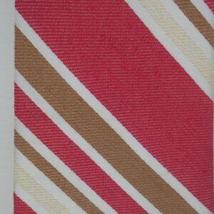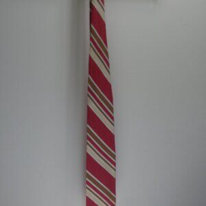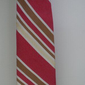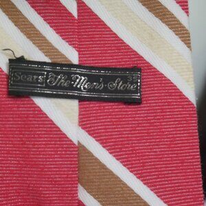 Vintage Sears Men's Store cotton-blend tie featuring bold diagonal stripes in red, tan, and cream. The vibrant red background is accented by alternating tan and cream stripes, creating a classic and eye-catching look. This tie is perfect for both formal and casual occasions, adding a pop of color and retro style to any outfit. The fabric appears smooth and well-maintained, with no visible flaws. From a smoke-free and pet-free home.