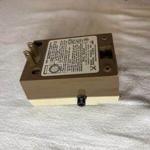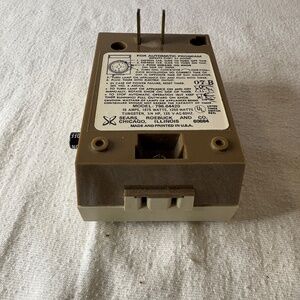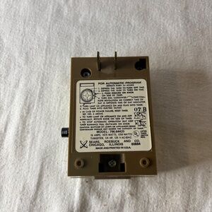 The Vintage Sears Plug In Timer Programmer 796.64420 is a 15A, 1250W, 125V lamp/holiday timer that can be mounted on the wall with its plug-in style. Made of ABS/plastic, this timer features a rotary switch and a decorative vintage style. It has one outlet and a rectangular box shape. The timer operates with a timer function and can be controlled with dial, switch, and push-button controls. This United States-made product from Sears is suitable for any room and offers a HomePlug smart home protocol for added convenience.