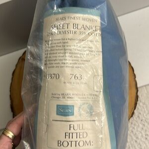 Sears sheet blanket in a royal blue light color. Made with 65% polyester and 35% cotton. Features a full fitted bottom.