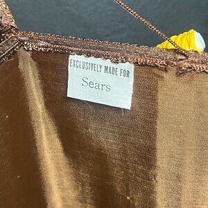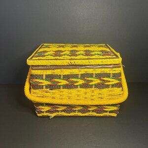 Selling a Vintage Sears Yellow and Brown Woven Wicker Sewing Box. It measures 7.75" (h) x 10.5" (l) x 8.5" (w), it has a hinged lid, top handle, and a plastic organizer that sits beneath the lid. The inner compartment measures 6.25" (h) x 8.75" (l) x 7" (w). The lid sits slightly off center (shown in the pictures), but it's in otherwise good condition!