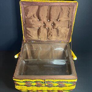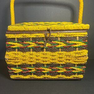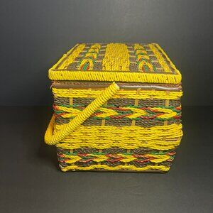 Vintage Sears Yellow & Brown Woven Wicker Hinged Lid Sewing Basket Box w/ Handle