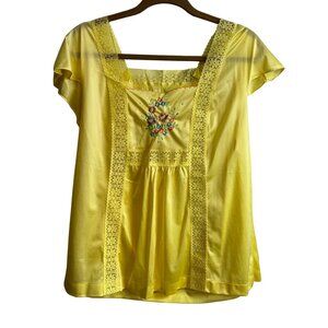 Vintage Sears Yellow Embroidered & Lace Trim Nylon Polyester Blouse Medium