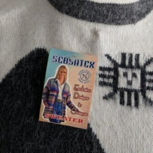 This charming and cozy vintage SEBSATEX 100% baby alpaca knit sweater, is new, with the tag still attached, which makes it pretty rare. The tight-knit sweater features a crew neck neckline and long sleeves with an alpaca farm pattern. The sweater is made of high-quality alpaca fiber.