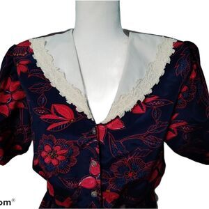 Vintage Secretary Geek Floral Navy Cherry Red Dress White Laced Collar Medium