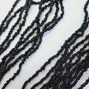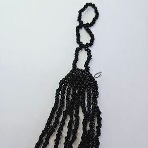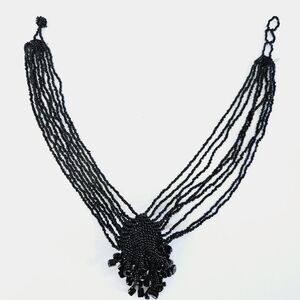 This is a gorgeous seed beaded statement necklace. Made from enumerable little black seed beads in multiple strands, meeting at a large cluster center piece. It is possible that this is hematite but I don't know for sure. It is hard to see from the pictures but it drapes beautifully on the neck. Certainly the star of the show for any outfit. The clasp is a beaded ball that fits into three loops depending on how you'd like it to lie. It is likely that this beautiful piece was hand crafted.
