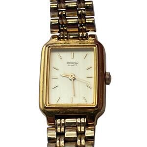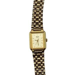 This vintage Seiko V401-5129 women's quartz tank watch is a classic timepiece that exudes elegance and sophistication.