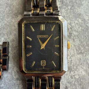 Vintage Seiko Watch Two Tone Black Dial Date Rectangle V739-5B19 *Needs Battery*