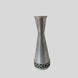 Mid-century modern vase in a silvery pewter metal by Selandia of Norway. It features a sleek aluminum body adorned with an eye-catching engraved geometric design. Its understated elegance and artisanal craftsmanship make it a unique piece that can add a touch of MCM vintage charm to any space. Whether displayed solo or with a floral arrangement, it’s a testament to timeless design.