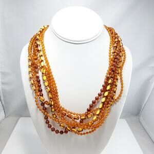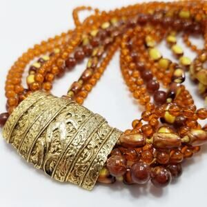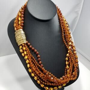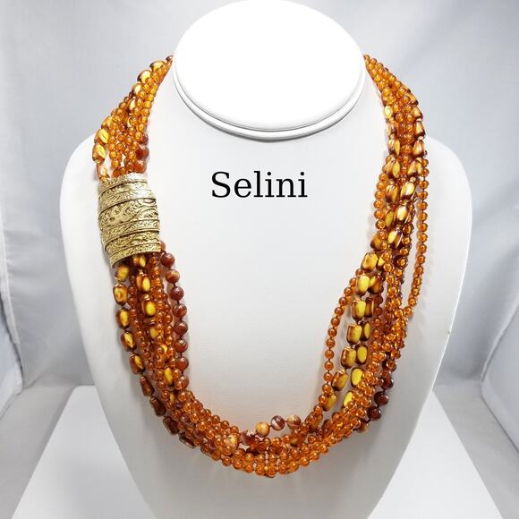*Description: This is a beautiful Selini Lucite beaded necklace with a large decorative hook clasp. The necklace has 8 strands. Most of the beads are topaz or root beer in color with two strands a root beer swirled with white. The clasp is a gold tone brass with a large hook on the back. The clasp is stamped SELINI with a copyright symbol. The strands are divided into two sections on the back with three on one and five on the other. The strands all mesh together when worn. This is a very lightweight necklace so easy to wear and forget you have it on. The only tiny weight is from the clasp. This is a great necklace for any occasion.