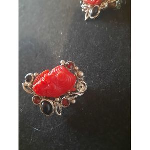 Vintage Selro Clip on Earrings Asian Red Devil 3 Missing Cabochon