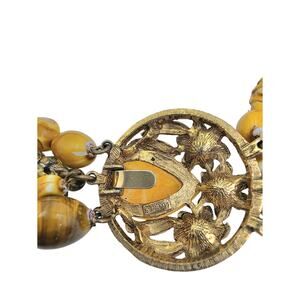 This Selro Selini statement necklace features 6 strands black, brown, and amber-colored beads of different shapes and sizes with a fancy goldtone clasp.