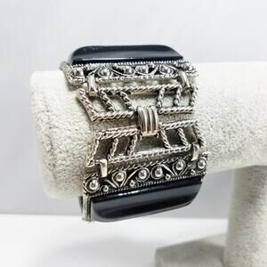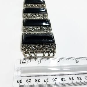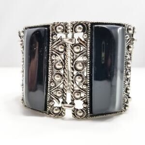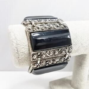 Make a bold statement with this vintage Selro-style bracelet from the 1960s. Designed in antique silver tone metal, the bracelet features four raised rectangular black Lucite panels with a smooth pyramid-like surface, framed by ornate filigree details. Its wide, chunky design embodies the dramatic style of mid-century costume jewelry.