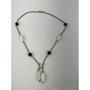 Vintage Semi Precious White Agate Onyx Beaded Brass Chain Lariat Necklace