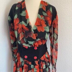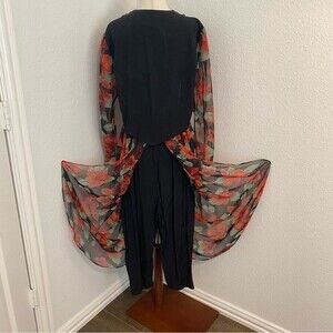 Rare, unique and stunning Sen Shi of California chiffon split flare loose palazzo pantaloon skirt & pencil pants. Black, red & green floral pattern. Vintage fashion at it's best! Matching 2 piece jacket with long sheer sleeves and crop length brings the unique and striking ensemble together. An eye catching statement piece! Draped, fairycore, goth, ballet, costume, pastel goth, vintage, retro, hippie, funky art to wear, avant garde, grunge, and vintage. Perfect for a special evening, travel, cruise, concert, festival, western event, alternative rock, edgy, costume party, or whimsical event.