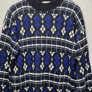 Vintage Separate Issue Mens Small Geometric Argyle Sweater Black Blue White