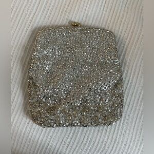 Shimmering silver clutch bag perfect for evening events. Add a touch of classic elegance to your outfit with this sparkling vintage find !! Only call out is slight lipstick marking as shown in photo. Can hold it from the handles or fold it up nicely and hold it that way!