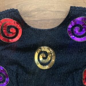 This dress SCREAMS 1970s/1980's complete with unique swirl pattern in red, purple, and yellow with the black sequined body.