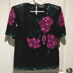 This black blouse with sequin floral design has character and is great for anyone who likes to have their wardrobe shine. Small line tear! Easy fix to hand sew. It's not noticeable at all