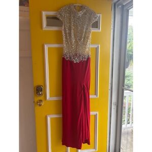 Evening gown for a special occasion. This floor-length maxi dress features a sequin-embellished bodice with short sleeves and a flattering high neckline. The fitted waistline transitions into a fitted red skirt with a side slit. A perfect choice for formal events, prom nights, cocktail parties, or any occasion. Excellent vintage condition. Buttons on threads are a bit loose, and some sequins are loose as well.