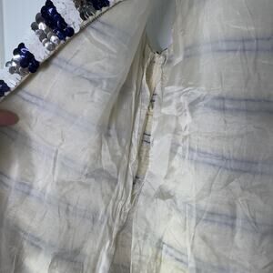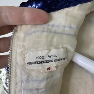 Fair vintage pre-owned condition with noticeable wear. Lining shows discoloration, small spots/stains, wrinkles, and areas of seam separation as shown. Sequins exhibit surface scuffs/scratches, some lint/debris, and a few loose threads noted. Back zipper functions properly. See photos for details.