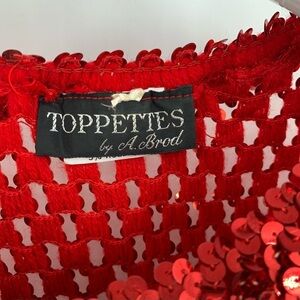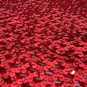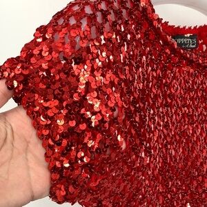 Red sequins (sequence) Elasticized fitted waist and cuffs. Disco vibes. Totally 80s. Great for retro looks.