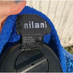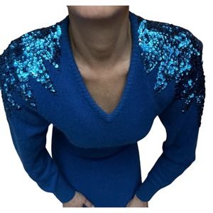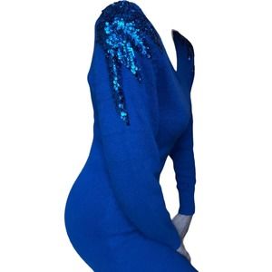 Vintage electric blue Nilani. Silk, angora, nylon and lambswool dress with sequin shoulders. Super soft, made to be worn against the body so that it hugs all the curves. Long sleeve pencil dress with padded shoulders and the subtle sequins—just right for a modern feel.