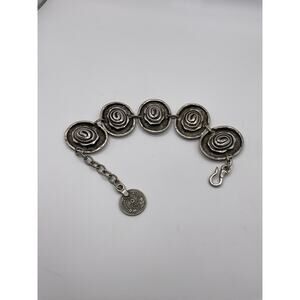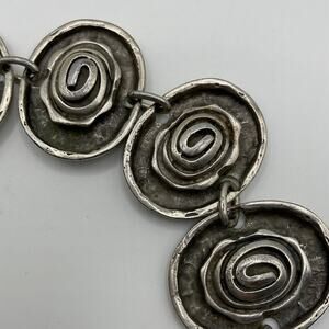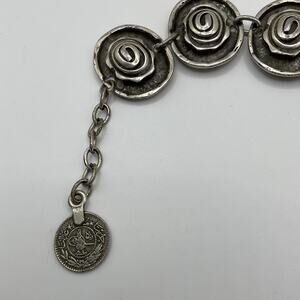 Striking vintage Seraglio bracelet composed of five textured spiral medallion links joined by bars, finished with a hook clasp and faux coin charm on the extender. Flexible 6–7.5” fit makes it great for stacking or wearing solo—perfect boho/Egyptian-revival accent.