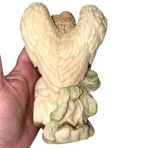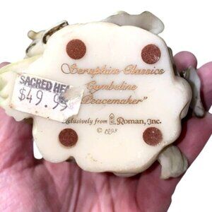 This angelic figurine from the Seraphim Classics collection radiates serenity and grace. Cymbeline, delicately holding a harp, embodies peace and harmony. Crafted in 1993 by Roman, Inc., the ivory-toned sculpture features exquisite gold accents, intricate details, and serene expressions. A timeless piece to adorn your collection or gift to a loved one.