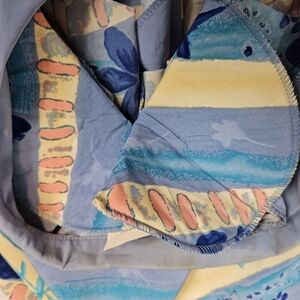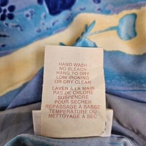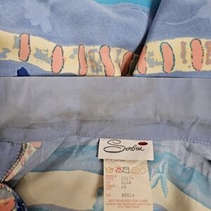 Features Vintage Serbin of Florida tropical blazer, silk like fabric in blue and yellow hues, blazer is adorned in hibiscus flowers, lightweight jacket notched collar, fun beach print, open front, 3/4 casual sleeve with folded cuff, shoulder pads, snow bird attire, Floridian resort wear, Floridian style.