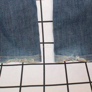 Really cool double buttoned Serfontaine made in California bootcut jeans distressed, mostly along the back hems of each pantleg. Vintage.