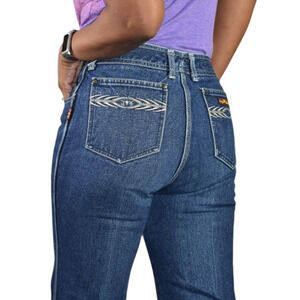 Vintage 80s Sergio Valente jeans FEATURE a high rise and straight legs. 5 pocket with button / zipper closure. Back pockets have iconic longhorn logo and maroon label on the right. Dark wash. Contrast light yellow stitching.