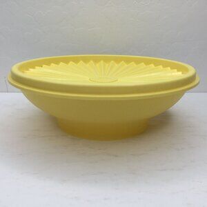 This Vintage Servalier Tupperware set from Hupper features 2 cereal bowls in vibrant yellow and blue colors, complete with eye-catching sunburst lids. Made of sturdy plastic, these pieces are perfect for storage.