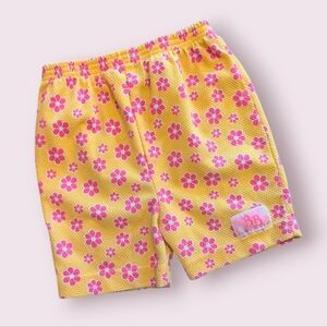 Brighten up your child's wardrobe with these Kids Yellow Floral Shorts. Featuring a cheerful pink floral pattern, these shorts are perfect for playful days. Textured waffle like fabric. Cotton/polyester blend.