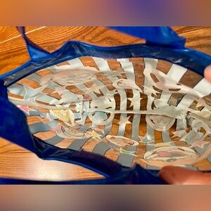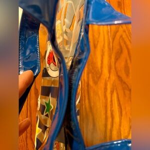 Vibrant tote bag with playful character designs. Features blue stripes and colorful stars.