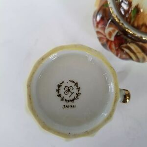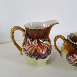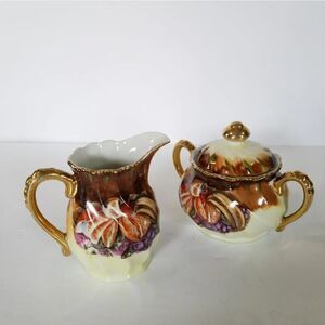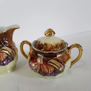 A charming sugar bowl and creamer that was made by Nippon Yoko Boeki Co Japan. The pattern is hand painted fruits and gold trim. What a wonderful statement this set will make on your table, buffet, or sideboard.