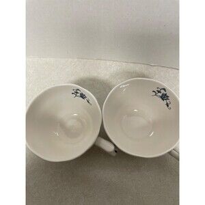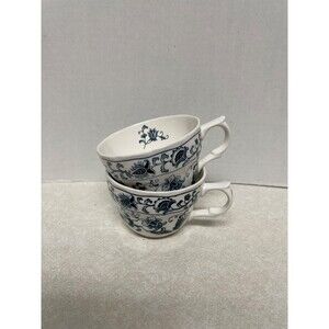 This is a vintage set of 2 Nikko tea or coffee cups in the Ming Tree pattern. The cups are white with a blue design, measuring 3" in height. They have an oriental style and are made of ironstone. The set includes two tea cups, and they are licensed reproductions from Japan.